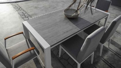 This dining table with an aluminum leg and a ceramic top is a great choice for those who love to entertain guests or dine al fresco.